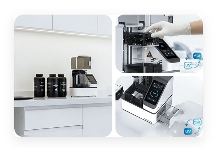 - Sistem Integrat Imprimare & Polimerizare: Nu mai ai nevoie de unități separate. După finalizarea imprimării, procesul de polimerizare se realizează în același dispozitiv, economisind spațiu și timp prețios.